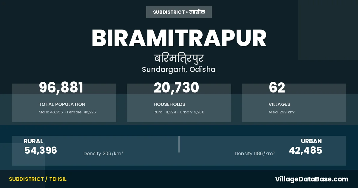 According to the 2011 census The total area of Biramitrapur Tehsil is 299 km², with a population of 96881 people. The population density is 324 inhabitants per square kilometre, and there are approximately 20730 houses in the sub district.