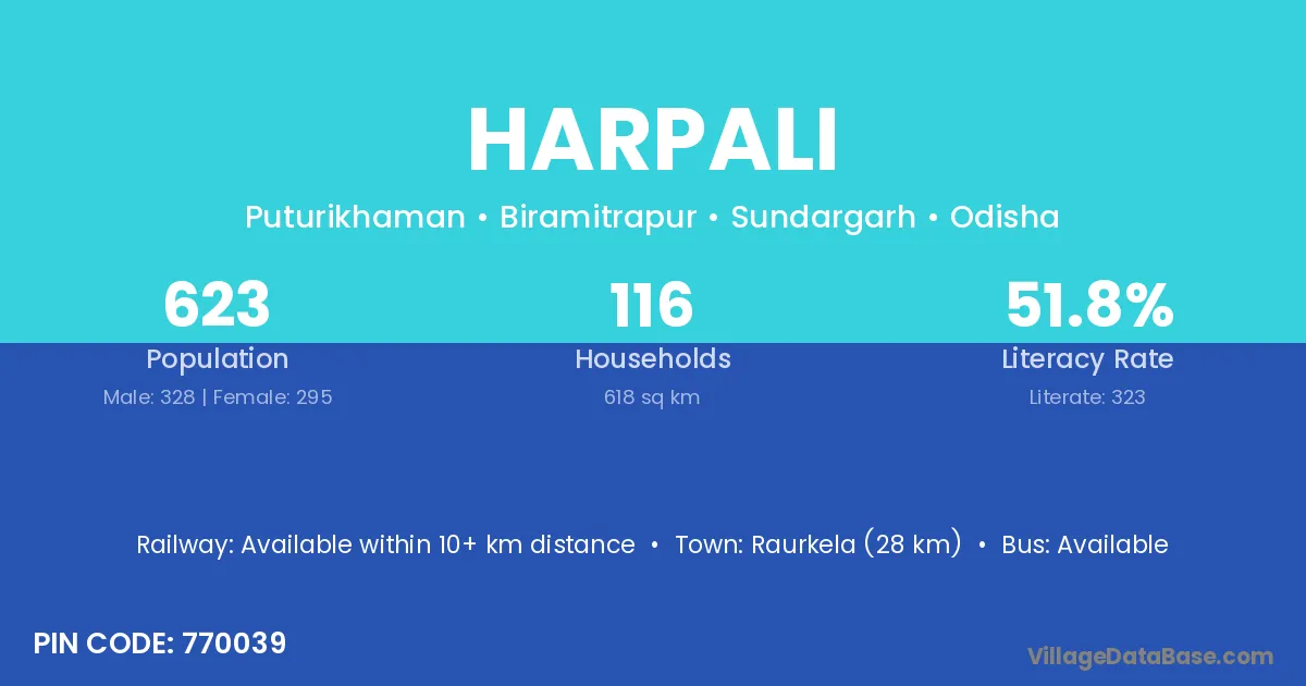 Raurkela (28 km) is the nearest town to Harpali village for major economic activities and is located approximately 28 km away.