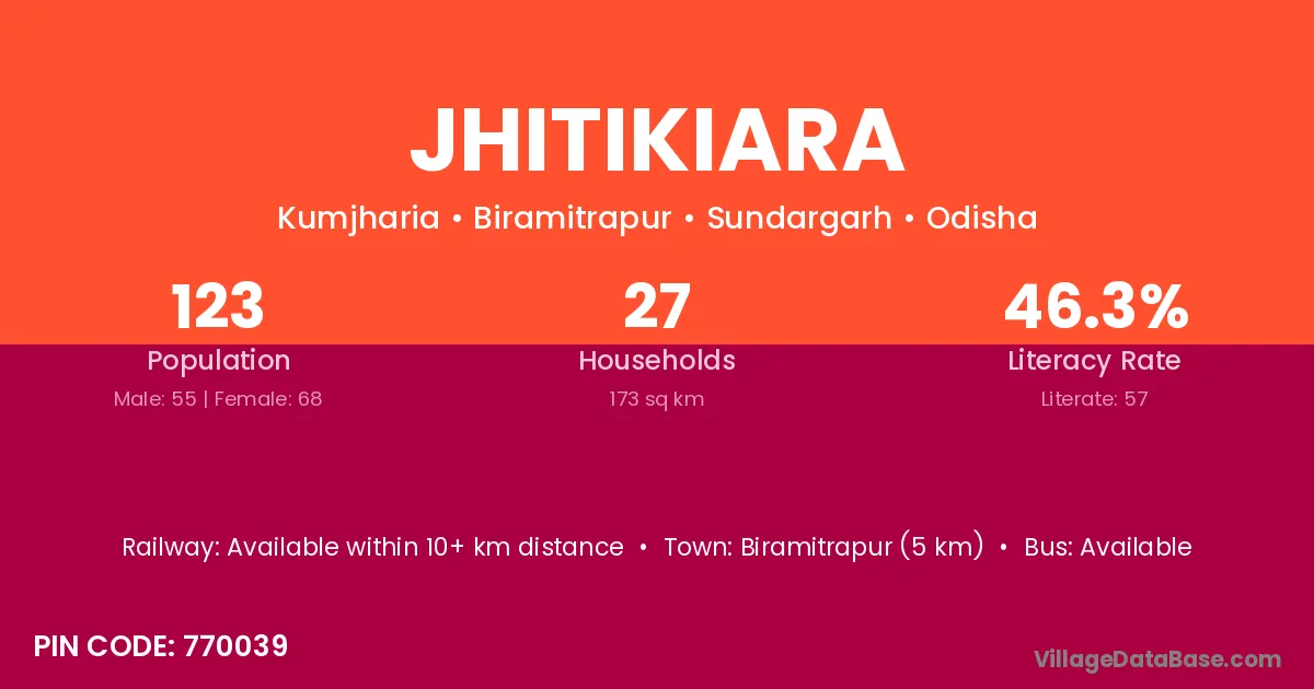 Biramitrapur (5 km) is the nearest town to Jhitikiara village for major economic activities and is located approximately 5 km away.