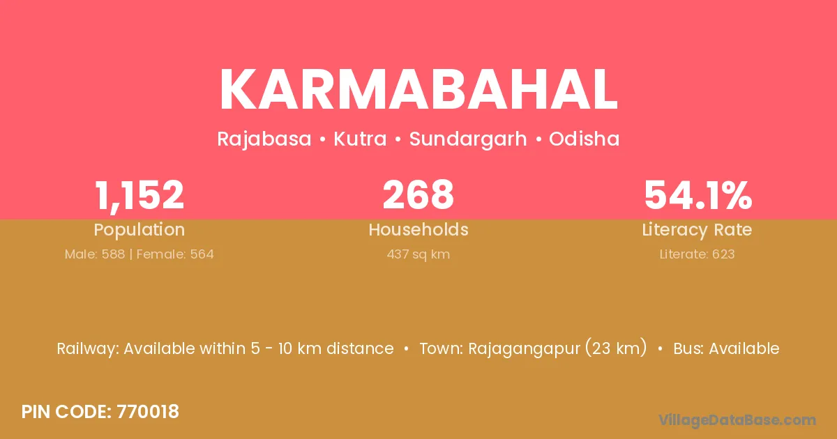Raurkela (10 km) is the nearest town to Karmabahal village for major economic activities and is located approximately 10 km away.