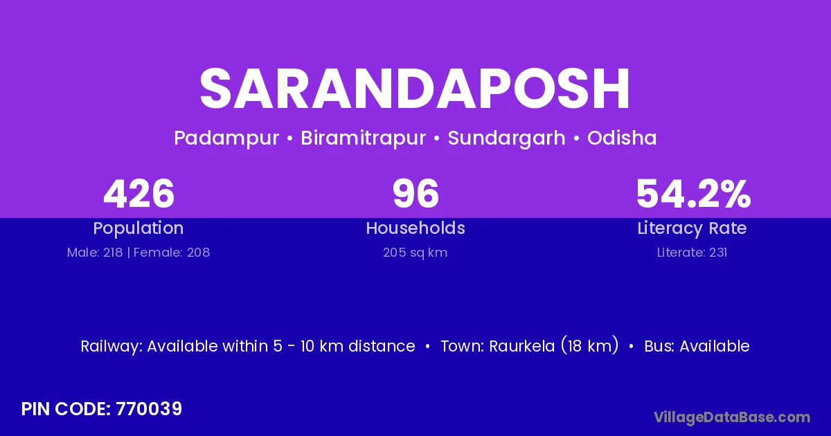 Raurkela (18 km) is the nearest town to Sarandaposh village for major economic activities and is located approximately 18 km away.
