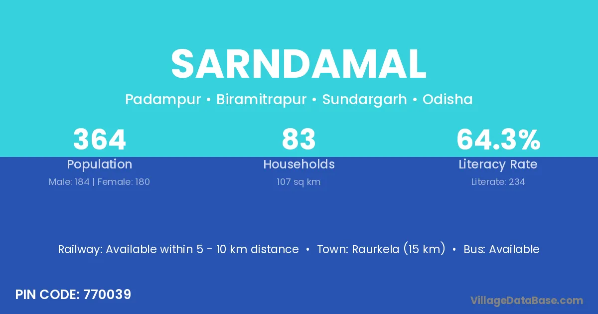 Raurkela (15 km) is the nearest town to Sarndamal village for major economic activities and is located approximately 15 km away.