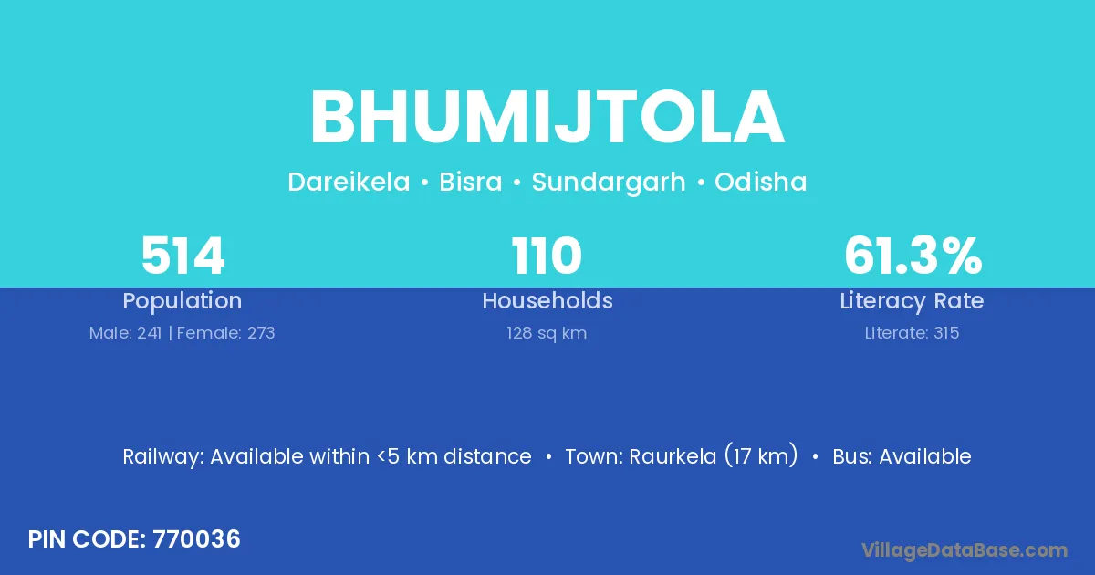 Raurkela (17 km) is the nearest town to Bhumijtola village for major economic activities and is located approximately 17 km away.