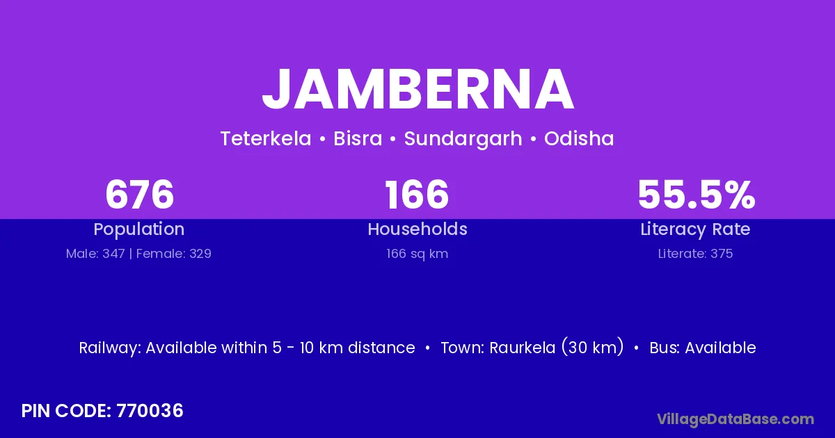 Raurkela (30 km) is the nearest town to Jamberna village for major economic activities and is located approximately 30 km away.