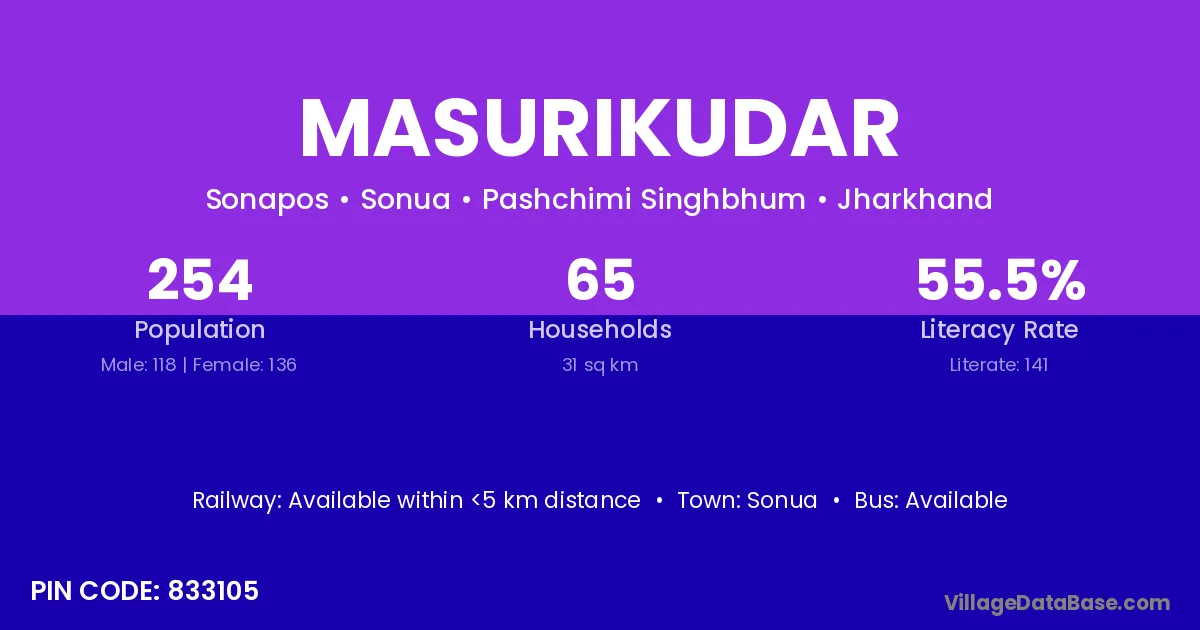 Raurkela (34 km) is the nearest town to Masurikudar village for major economic activities and is located approximately 34 km away.