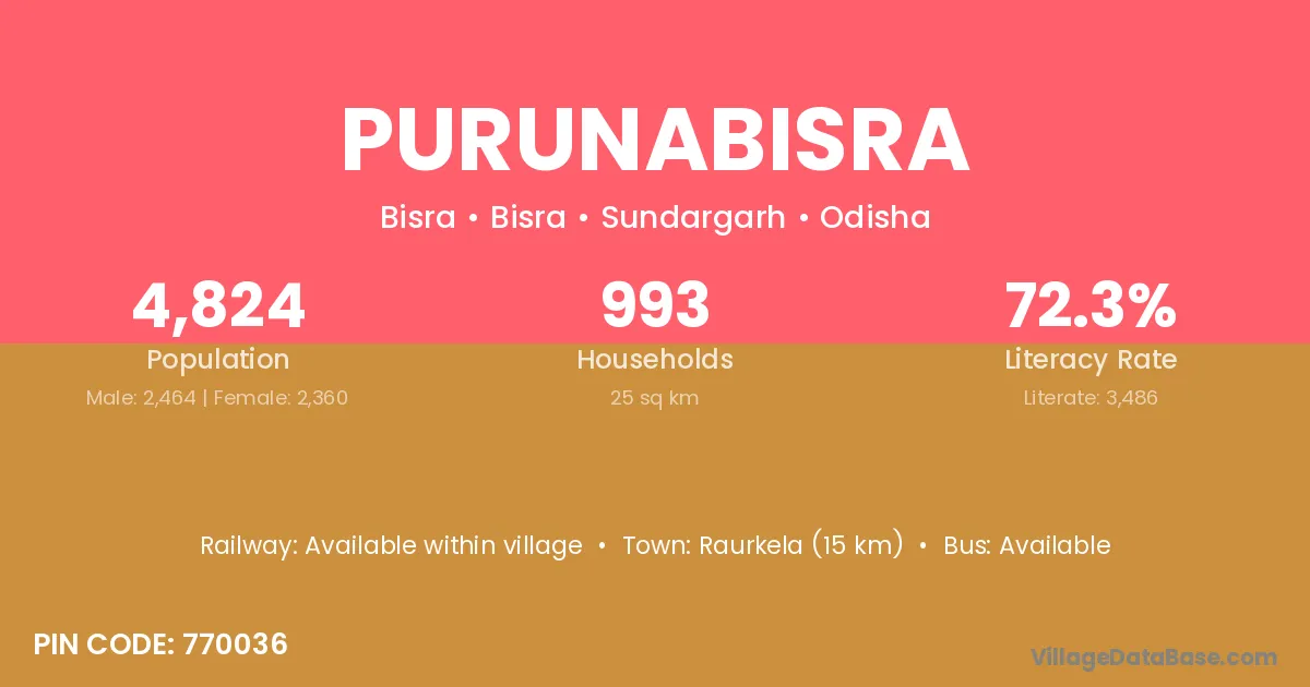 Raurkela (15 km) is the nearest town to Purunabisra village for major economic activities and is located approximately 15 km away.