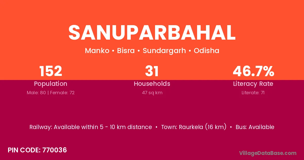 Raurkela (16 km) is the nearest town to Sanuparbahal village for major economic activities and is located approximately 16 km away.
