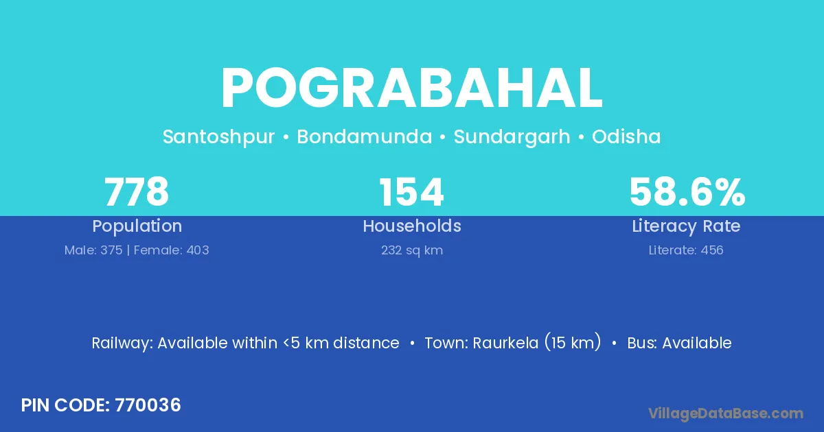 Raurkela (15 km) is the nearest town to Pograbahal village for major economic activities and is located approximately 15 km away.