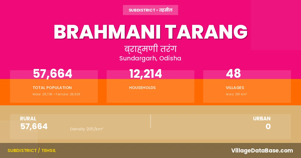 According to the 2011 census The total area of Brahmani Tarang Tehsil is 281 km², with a population of 57664 people. The population density is 205 inhabitants per square kilometre, and there are approximately 12214 houses in the sub district.