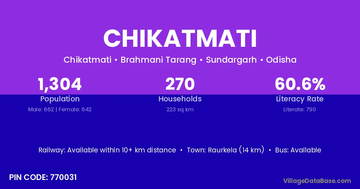 Raurkela (14 km) is the nearest town to Chikatmati village for major economic activities and is located approximately 14 km away.