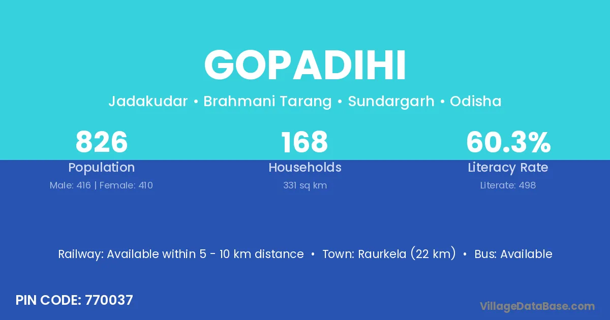 Raurkela (22 km) is the nearest town to Gopadihi village for major economic activities and is located approximately 22 km away.