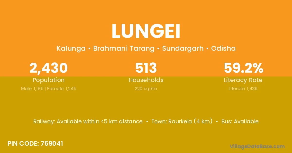 Raurkela (4 km) is the nearest town to Lungei village for major economic activities and is located approximately 4 km away.