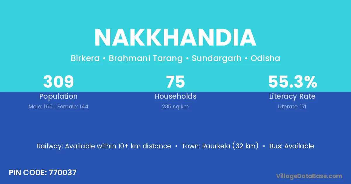 Raurkela (32 km) is the nearest town to Nakkhandia village for major economic activities and is located approximately 32 km away.
