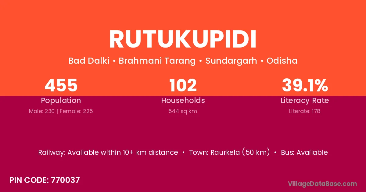 Raurkela (50 km) is the nearest town to Rutukupidi village for major economic activities and is located approximately 50 km away.