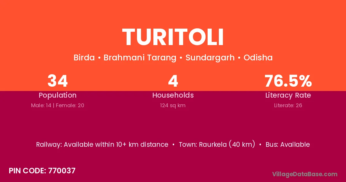 Raurkela (40 km) is the nearest town to Turitoli village for major economic activities and is located approximately 40 km away.