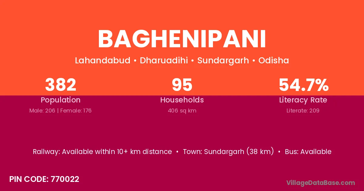 Sundargarh (38 km) is the nearest town to Baghenipani village for major economic activities and is located approximately 38 km away.