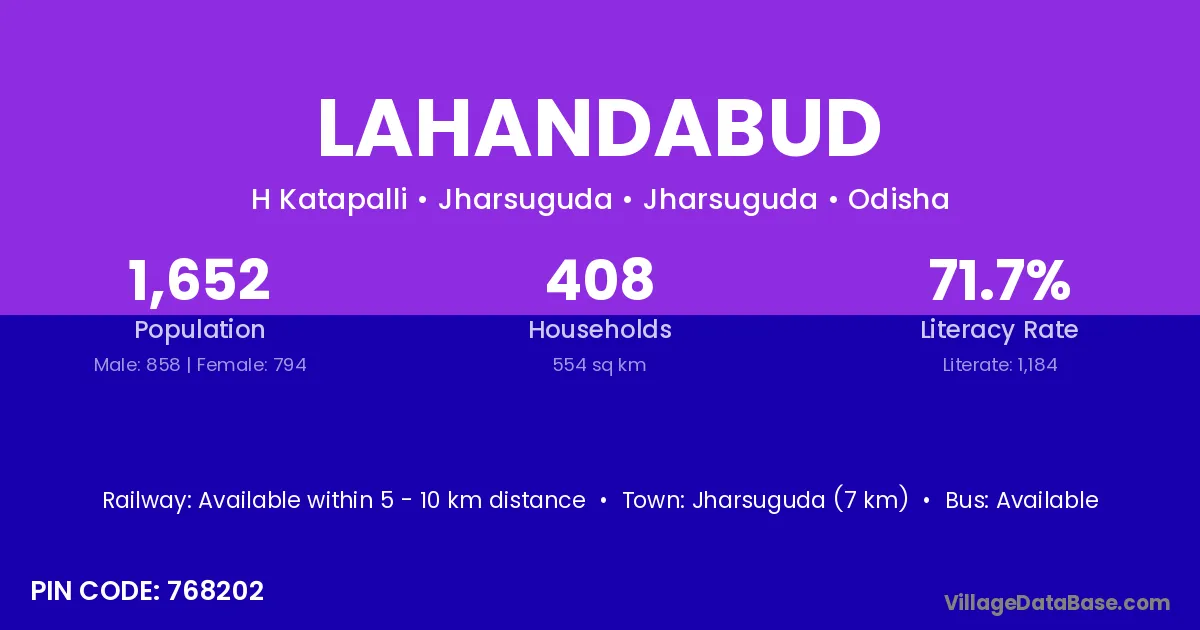Sundargarh (30 km) is the nearest town to Lahandabud village for major economic activities and is located approximately 30 km away.