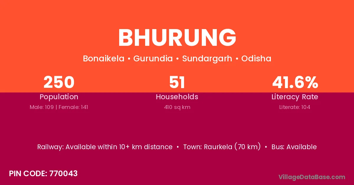 Raurkela (70 km) is the nearest town to Bhurung village for major economic activities and is located approximately 70 km away.