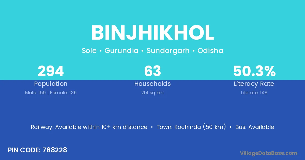 Kochinda (50 km) is the nearest town to Binjhikhol village for major economic activities and is located approximately 50 km away.