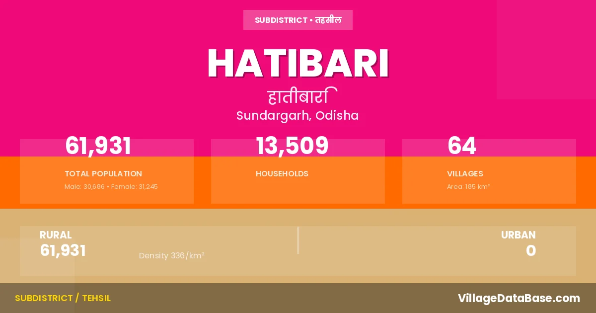 According to the 2011 census The total area of Hatibari Tehsil is 185 km², with a population of 61931 people. The population density is 336 inhabitants per square kilometre, and there are approximately 13509 houses in the sub district.