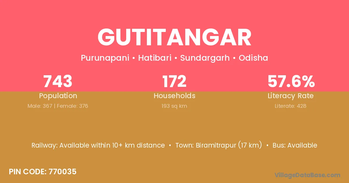 Biramitrapur (17 km) is the nearest town to Gutitangar village for major economic activities and is located approximately 17 km away.