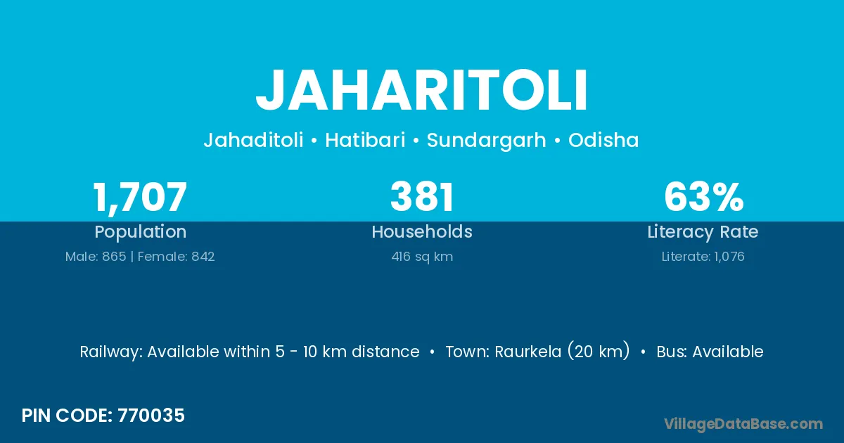 Raurkela (20 km) is the nearest town to Jaharitoli village for major economic activities and is located approximately 20 km away.