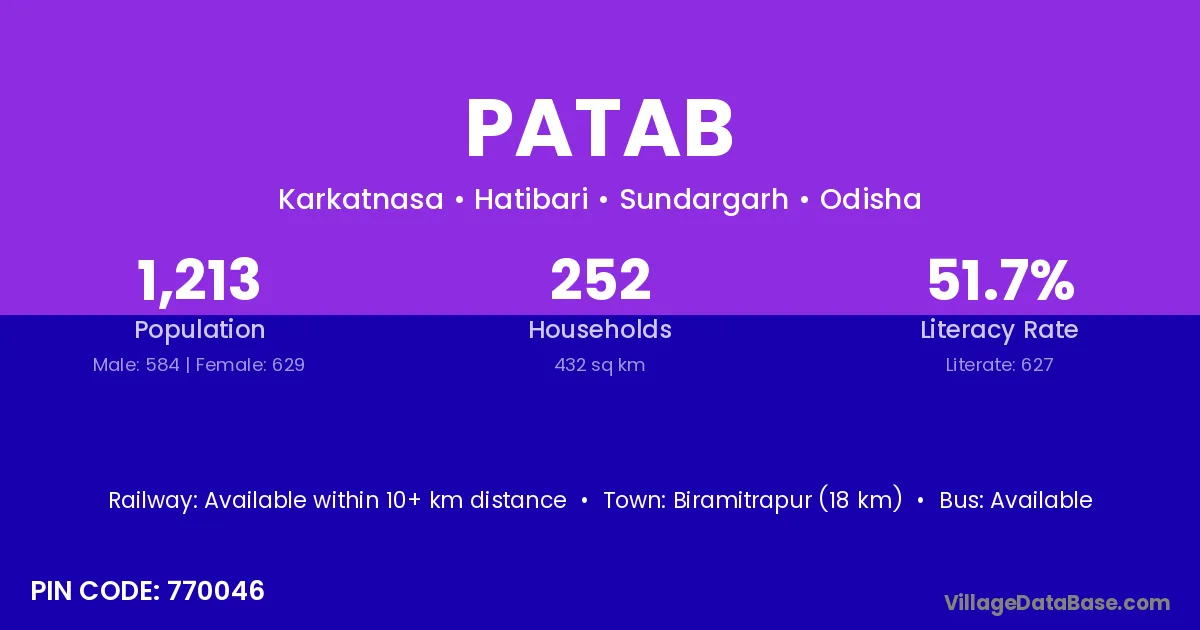 Biramitrapur (18 km) is the nearest town to Patab village for major economic activities and is located approximately 18 km away.
