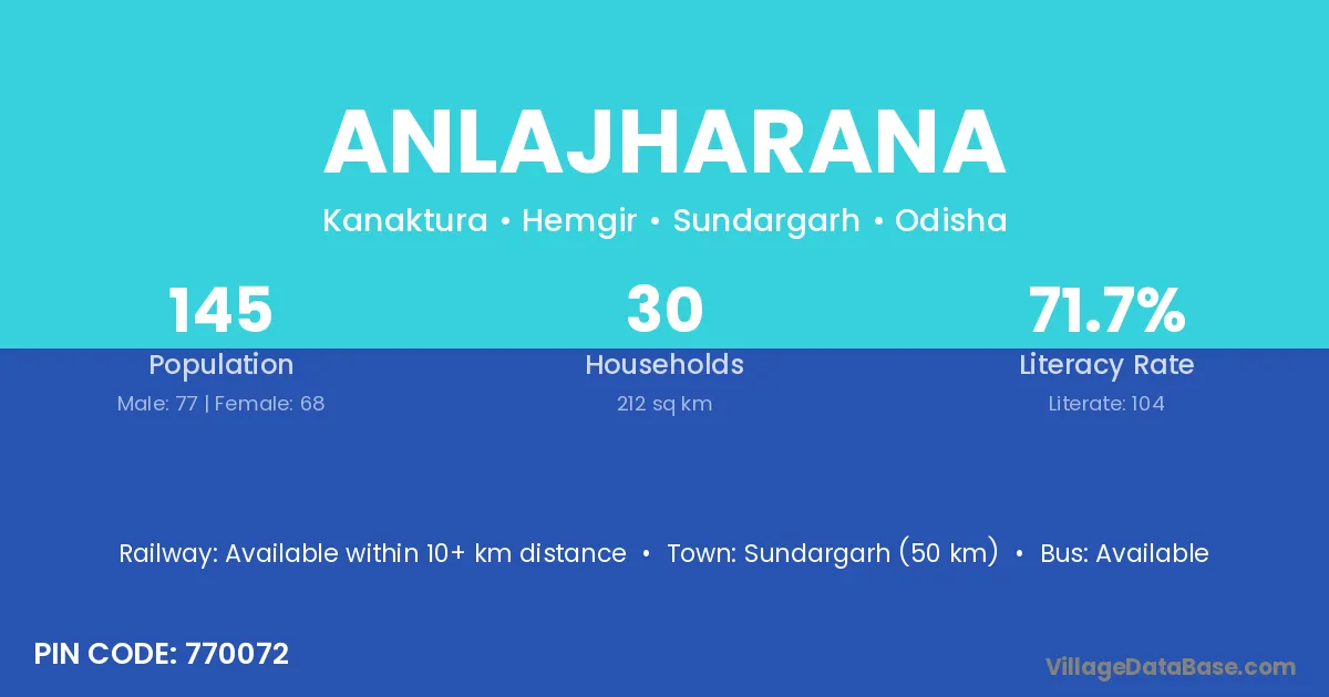 Sundargarh (50 km) is the nearest town to Anlajharana village for major economic activities and is located approximately 50 km away.