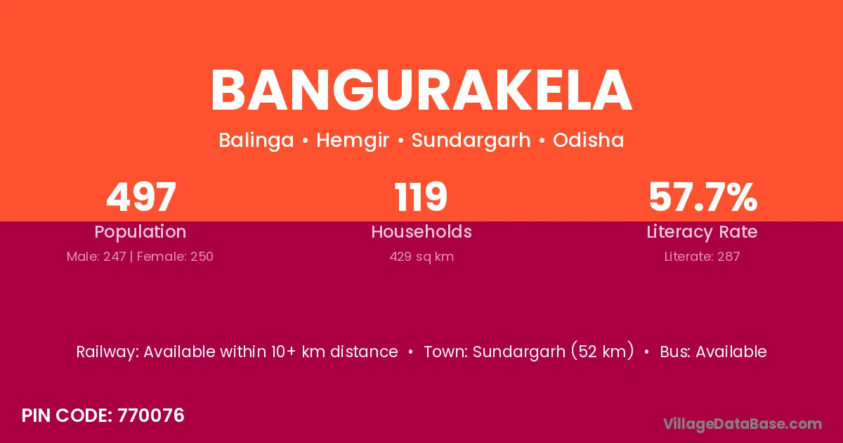 Bangurakela village has a total population of 497 people, of which 247 are males and 250 are females.