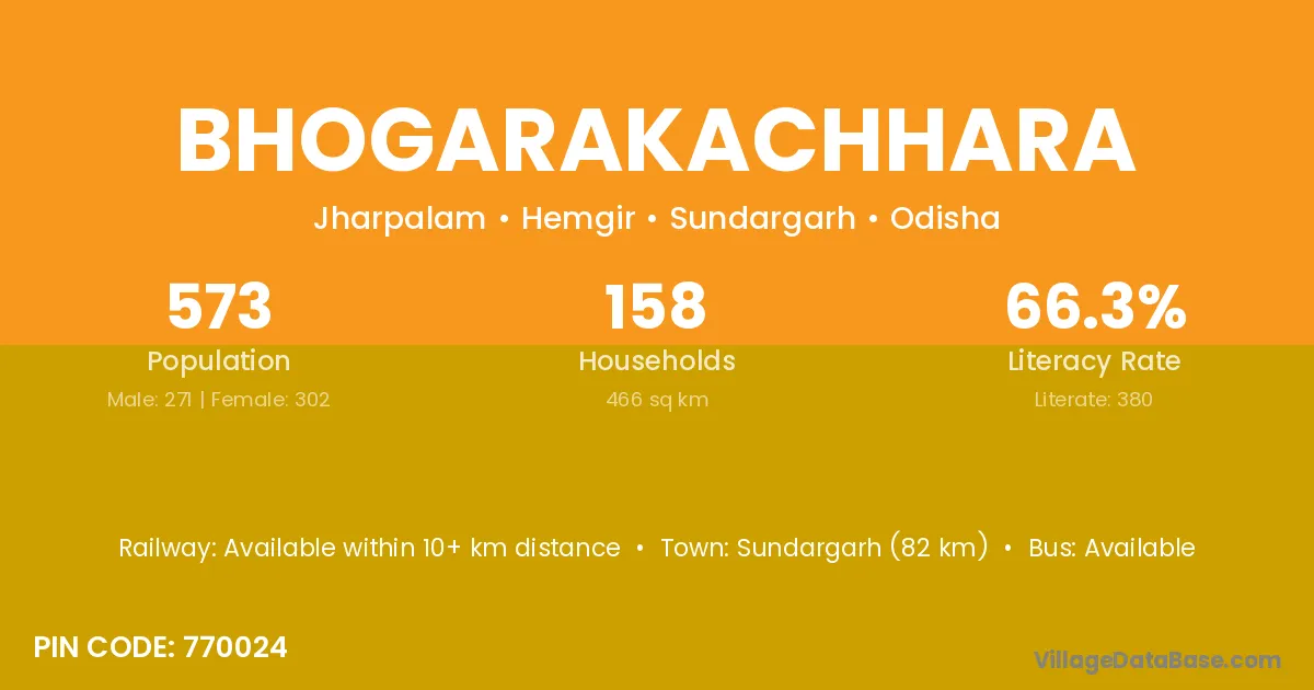 Sundargarh (82 km) is the nearest town to Bhogarakachhara village for major economic activities and is located approximately 82 km away.