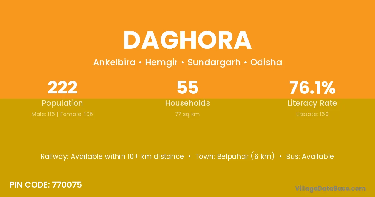 Belpahar (6 km) is the nearest town to Daghora village for major economic activities and is located approximately 6 km away.