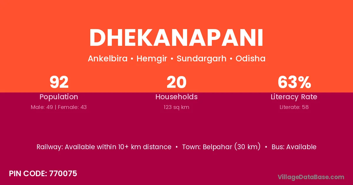 Dhekanapani village has a total population of 92 people, of which 49 are males and 43 are females.