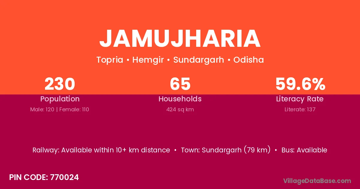 Sundargarh (79 km) is the nearest town to Jamujharia village for major economic activities and is located approximately 79 km away.