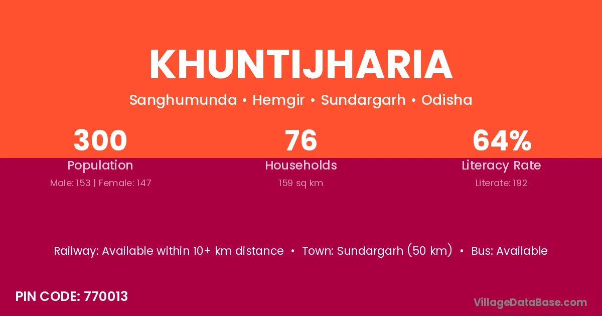Sundargarh (50 km) is the nearest town to Khuntijharia village for major economic activities and is located approximately 50 km away.