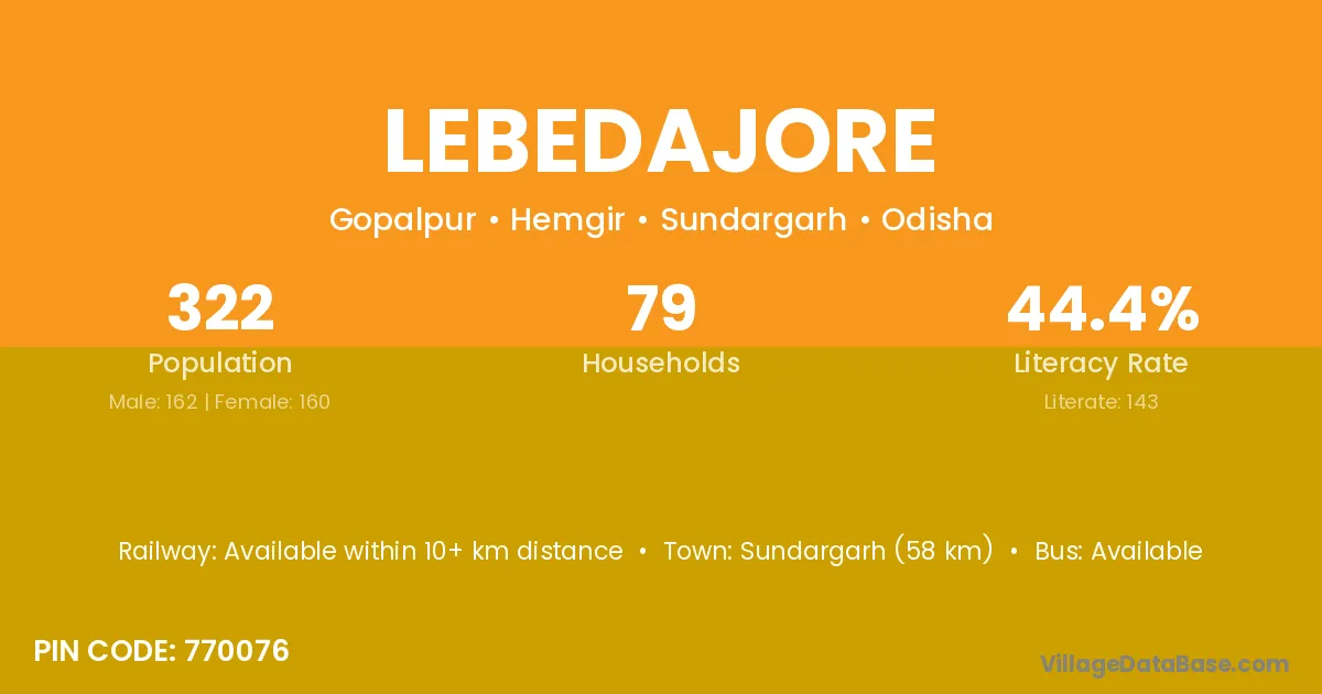 Sundargarh (58 km) is the nearest town to Lebedajore village for major economic activities and is located approximately 58 km away.