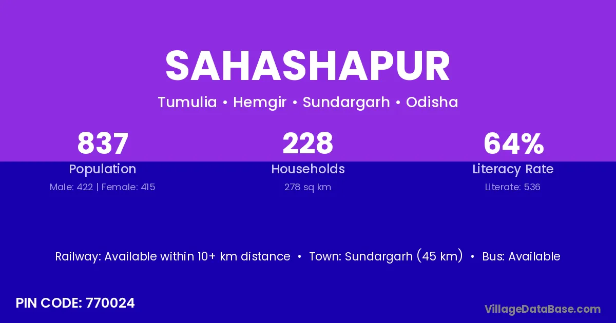 Sundargarh (45 km) is the nearest town to Sahashapur village for major economic activities and is located approximately 45 km away.