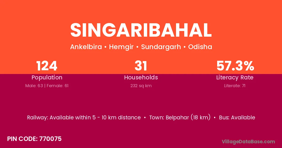 Belpahar (18 km) is the nearest town to Singaribahal village for major economic activities and is located approximately 18 km away.