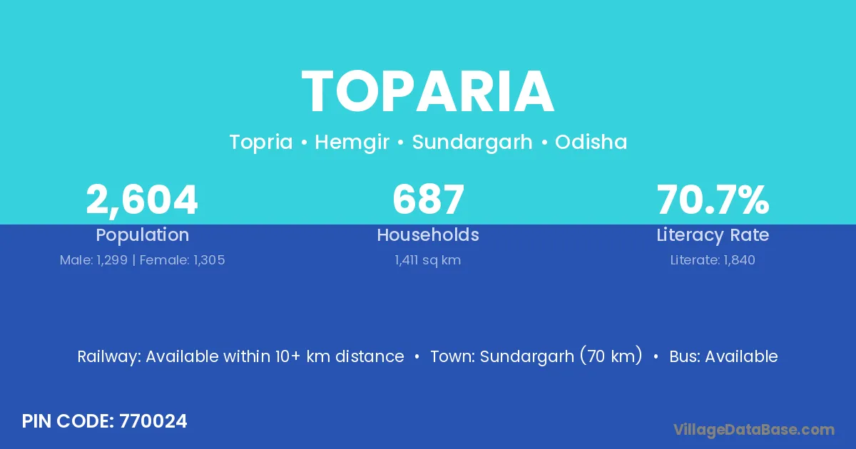 Sundargarh (70 km) is the nearest town to Toparia village for major economic activities and is located approximately 70 km away.