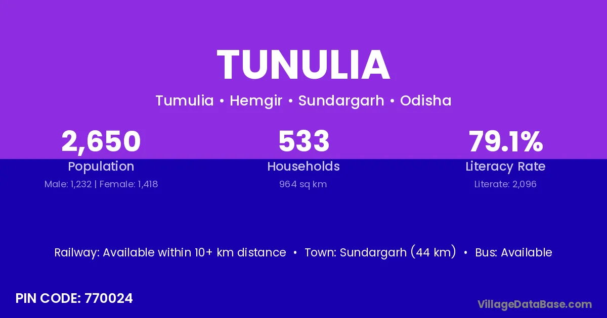 Sundargarh (44 km) is the nearest town to Tunulia village for major economic activities and is located approximately 44 km away.