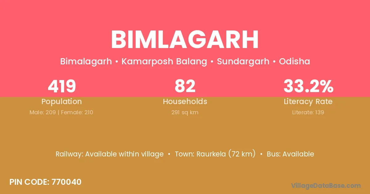 Raurkela (72 km) is the nearest town to Bimlagarh village for major economic activities and is located approximately 72 km away.