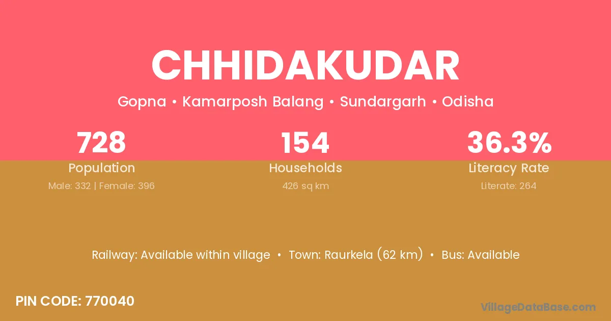 Raurkela (62 km) is the nearest town to Chhidakudar village for major economic activities and is located approximately 62 km away.