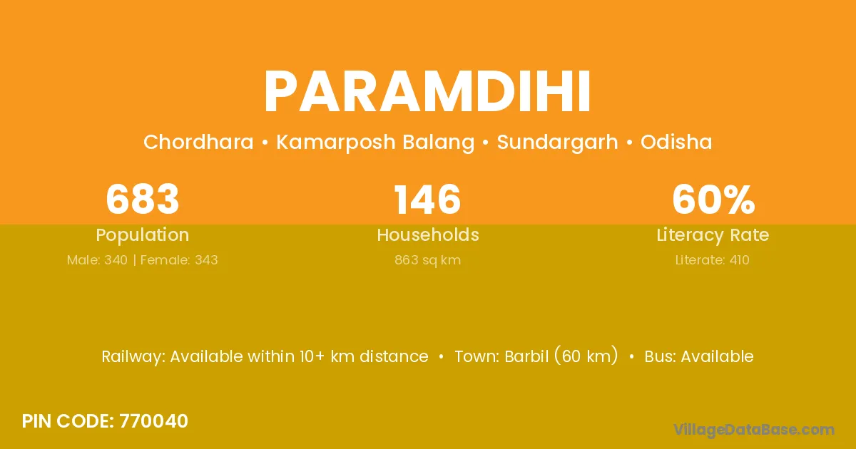 Barbil (60 km) is the nearest town to Paramdihi village for major economic activities and is located approximately 60 km away.