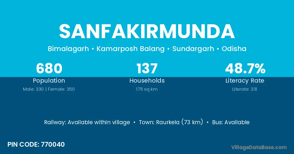Raurkela (73 km) is the nearest town to Sanfakirmunda village for major economic activities and is located approximately 73 km away.