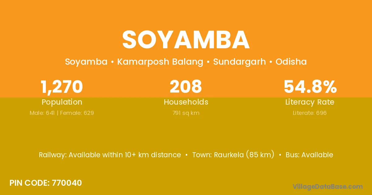 Raurkela (85 km) is the nearest town to Soyamba village for major economic activities and is located approximately 85 km away.
