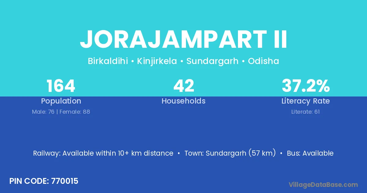 Sundargarh (57 km) is the nearest town to Jorajampart Ii village for major economic activities and is located approximately 57 km away.