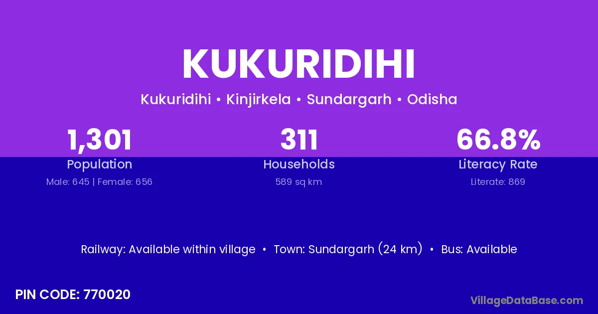 Sundargarh (24 km) is the nearest town to Kukuridihi village for major economic activities and is located approximately 24 km away.