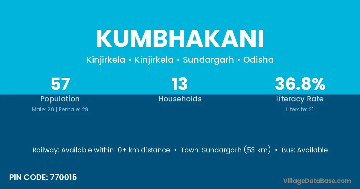 Sundargarh (53 km) is the nearest town to Kumbhakani village for major economic activities and is located approximately 53 km away.