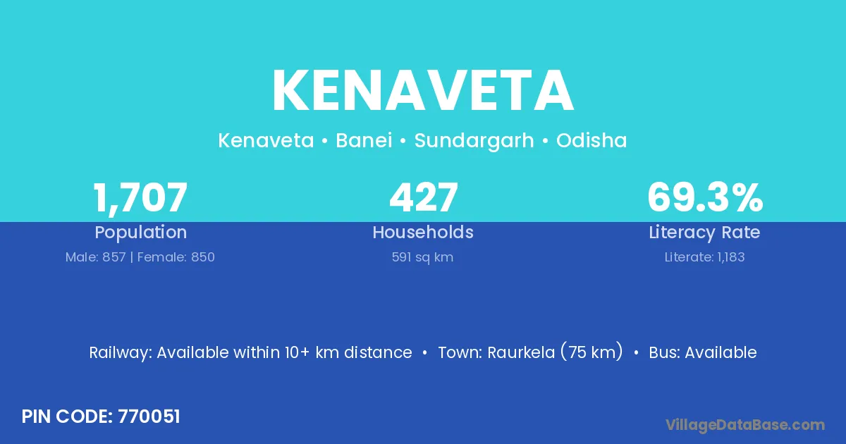 Barbil (22 km) is the nearest town to Kenaveta village for major economic activities and is located approximately 22 km away.