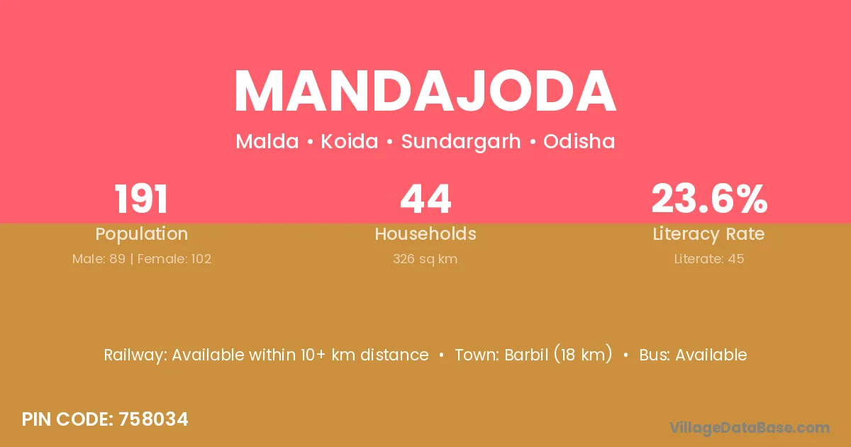 Barbil (18 km) is the nearest town to Mandajoda village for major economic activities and is located approximately 18 km away.