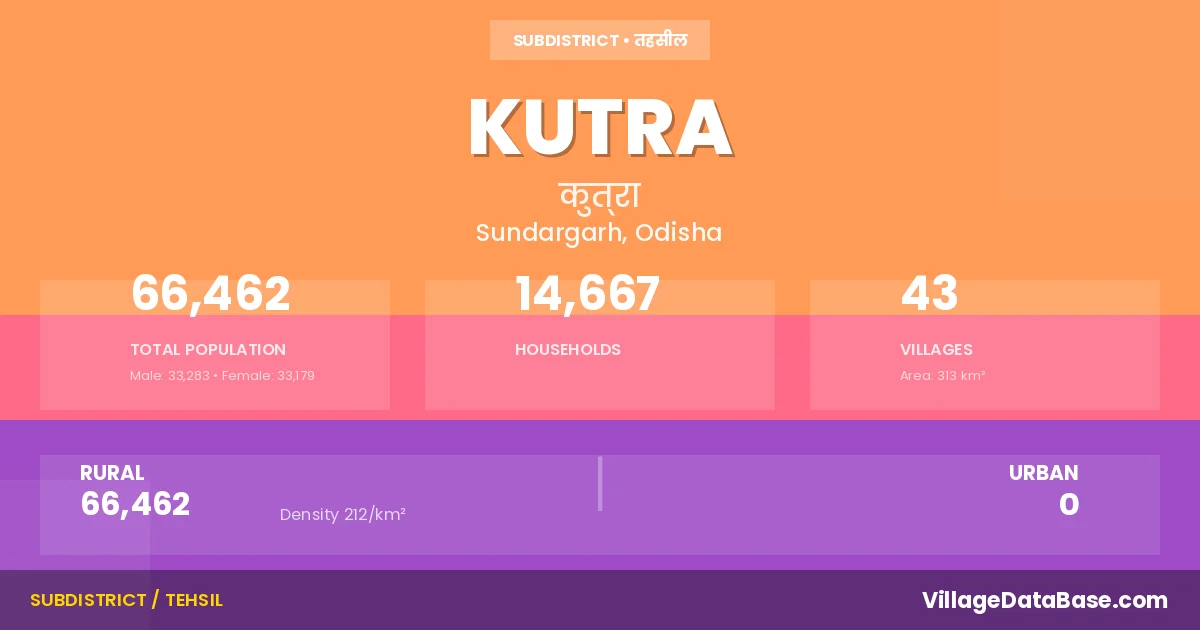 According to the 2011 census The total area of Kutra Tehsil is 313 km², with a population of 66462 people. The population density is 212 inhabitants per square kilometre, and there are approximately 14667 houses in the sub district.